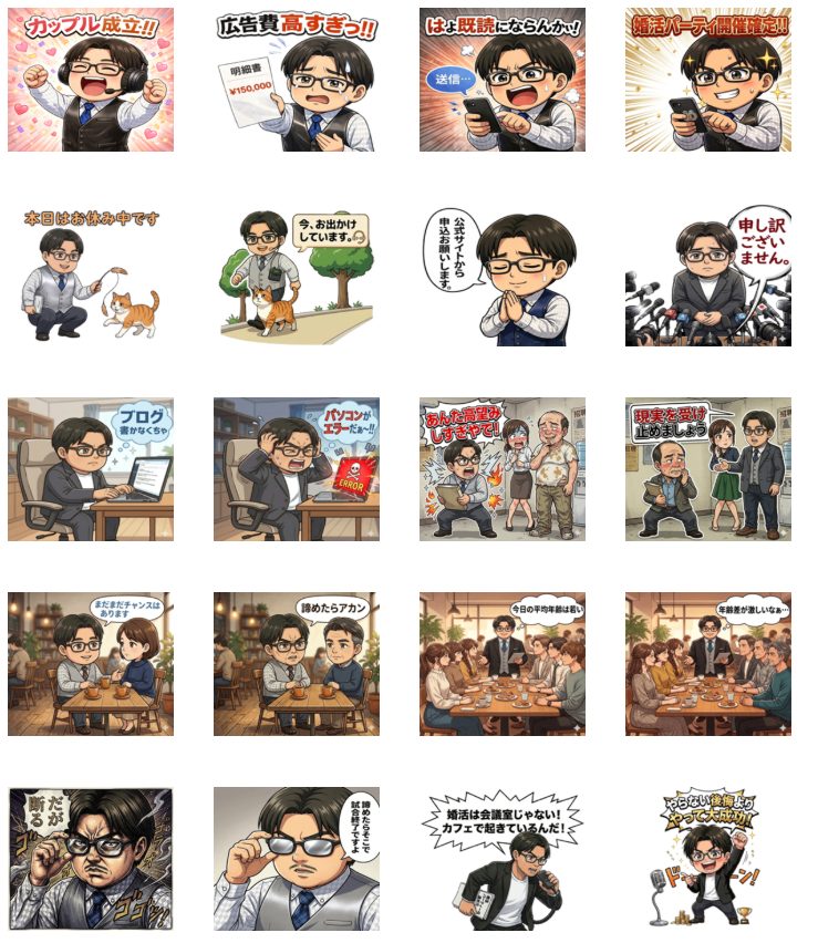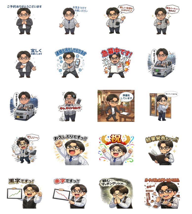 11年前に作った時は可愛らしいキャラクターのスタンプでしたが、今回のテーマは… 「婚活パーティー主催者側の日常」となります。